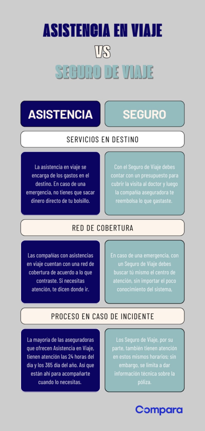 La asistencia en viaje se encarga de los gastos directamente en el destino. En caso de una emergencia, los contactas y ellos te dan las indicaciones para que recibas atención sin tener que sacar dinero directamente de tu bolsillo. En cambio el seguro, debes contar con un presupuesto para cubrir la visita al doctor y luego la compañía aseguradora te reembolsa lo que gastaste.
